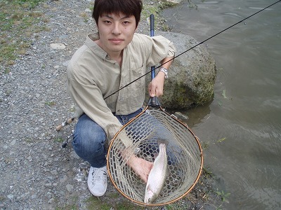当日は快晴、気温は20℃前後と若干高め、時間帯がお昼ということもあってか、ライズしている魚の姿はなく、魚の活性は全体的に低めである。部員は皆スプーンのスローリトリーブでトラウトを狙うもなかなか渋い状況。この段階でタフコンデションと見た僕は、スプーンを蓮華1,5gにチェンジし、ボトム付近をトレース、すると小型ながらもレインボーがヒット。この後、部員達も軽めのスプーンをセットし、リトリーブをスローにすると、コンスタントにヒットが続く。中には、ルアーフィッシングがはじめての部員もおり、キャスティングできるか、僕も心配であったが、釣り開始から3時間後にはすでに全員が魚をキャッチしていた。